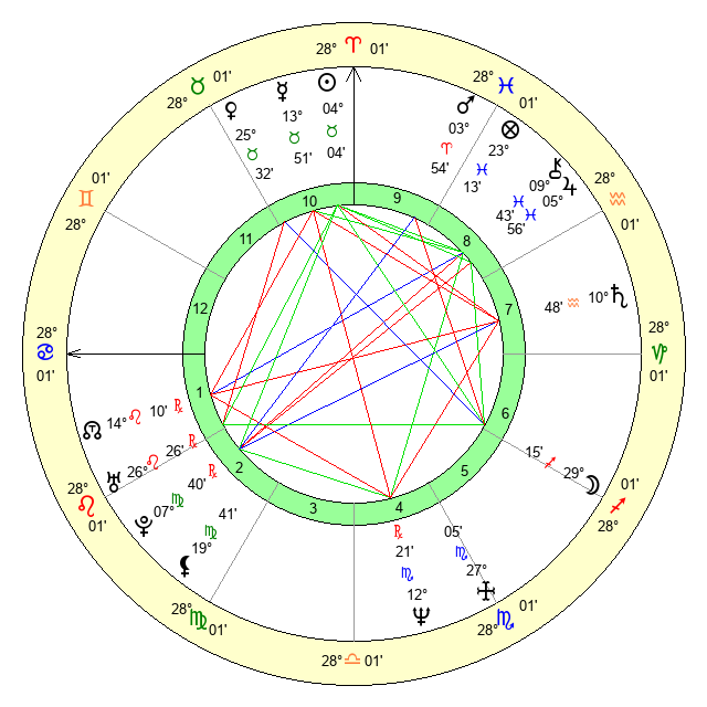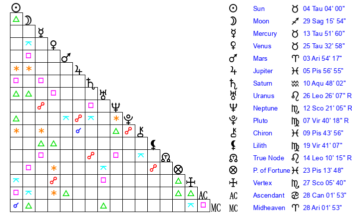 Moon | 29 Sagittarius 17 | 21 Pisces 52 | 27 Aries 50 |