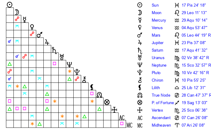 | Saturn | 17 Aquarius 56 | 21 Pisces 34 | 22 Aquarius 51 |