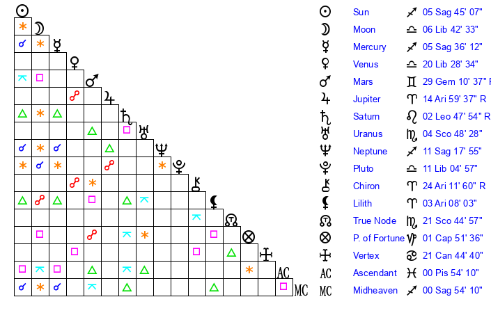 | Neptune | 11 Sagittarius 17 | 27 Pisces 9 | 13 Sagittarius 1 |