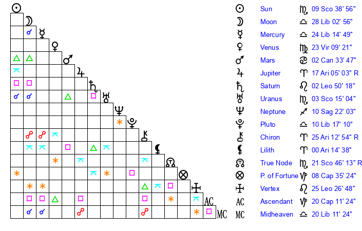 | Venus | 23 Virgo 9 | 24 Libra 42 | 18 Scorpio 18 |