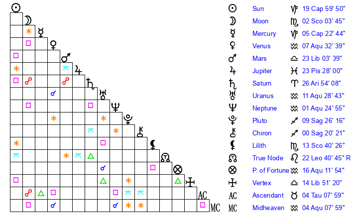 | Mercury | 5 Capricorn 23 | 3 Capricorn 16 | 17 Aquarius 33 |