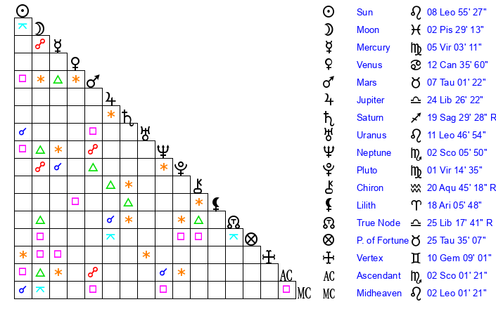 | Moon | 2 Pisces 26 | 11 Scorpio 41 | 3 Leo 53 |