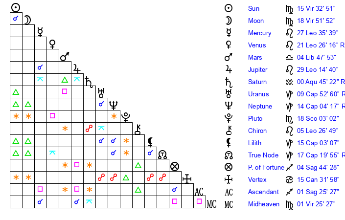 | Sun | 15 Virgo 32 | 16 Virgo 18 | 18 Libra 52 |