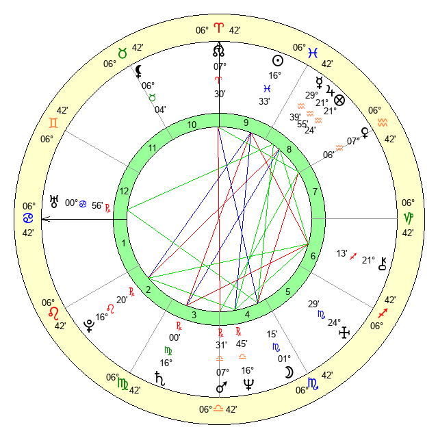 | Moon | 1 Scorpio 8 | 0 Cancer 21 | 22 Cancer 8 |