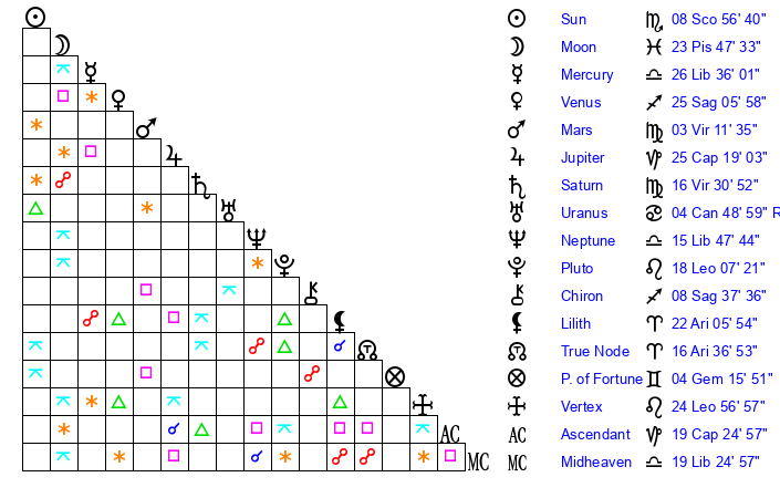 | Neptune | 15 Libra 48 | 29 Pisces 46 | 17 Libra 21 |