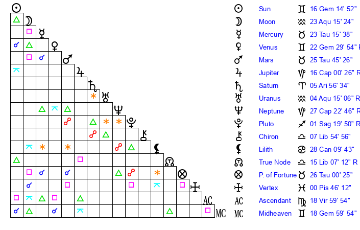 | Moon | 23 Aquarius 13 | 25 Libra 21 | 17 Pisces 19 |