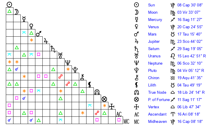 Moon | 3 Virgo 29 | 6 Capricorn 43 | 12 Aquarius 58 |