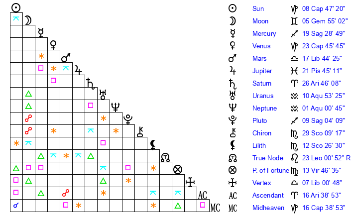 | Sun | 8 Capricorn 48 | 9 Capricorn 30 | 5 Aquarius 17 |