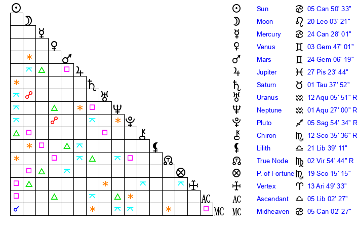 | Sun | 5 Cancer 50 | 6 Cancer 18 | 1 Leo 35 |