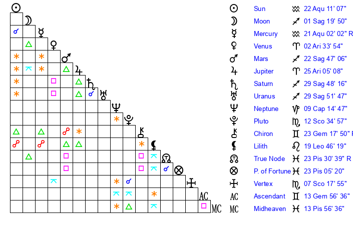 | Sun | 22 Aquarius 11 | 23 Aquarius 13 | 29 Pisces 18 |