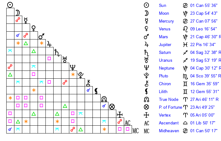 | Neptune | 4 Capricorn 29 | 2 Aries 8 | 3 Capricorn 30 |