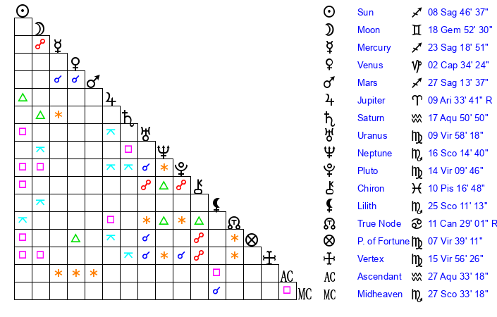 | Moon | 18 Gemini 46 | 23 Aries 53 | 28 Virgo 42 |