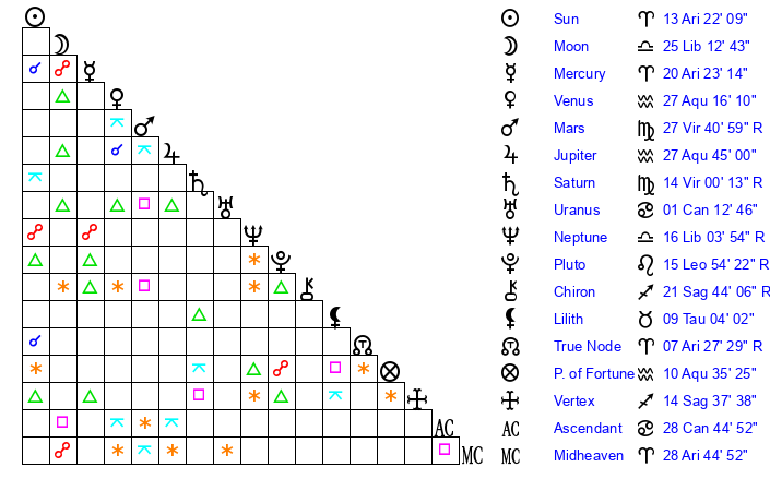 | Moon | 25 Libra 12 | 26 Gemini 40 | 19 Cancer 19 |