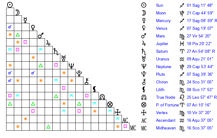 | Neptune | 29 Capricorn 53 | 27 Pisces 11 | 0 Aquarius 37 |