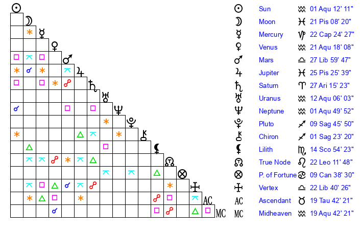 | Venus | 21 Aquarius 19 | 18 Pisces 34 | 23 Pisces 38 |