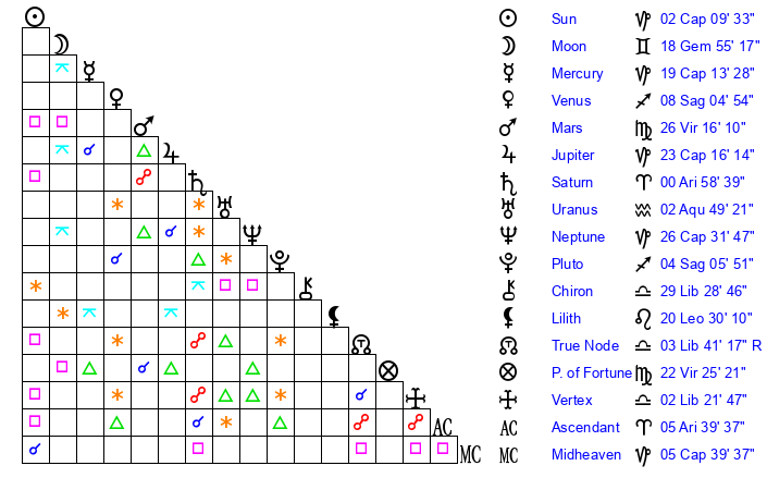 | Sun | 2 Capricorn 9 | 2 Capricorn 22 | 0 Aquarius 41 |