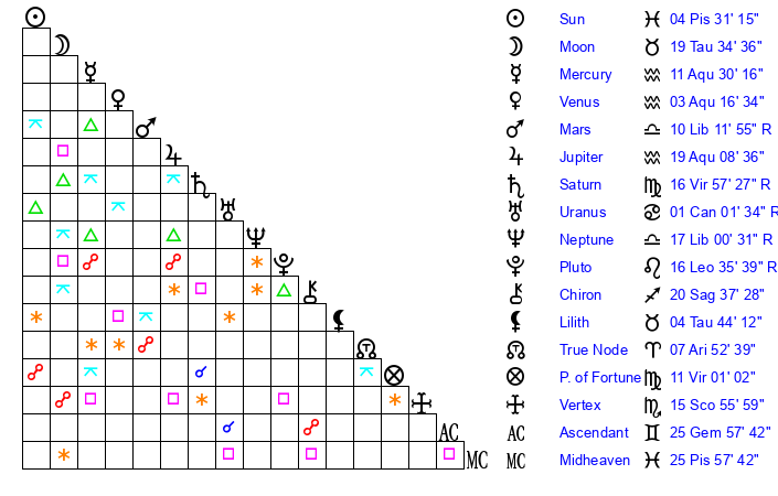 | Neptune | 17 Libra 0 | 28 Pisces 42 | 15 Libra 7 |