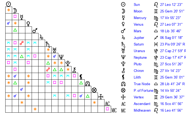 Venus | 27 Leo 8 | 24 Cancer 4 | 4 Libra 21 |