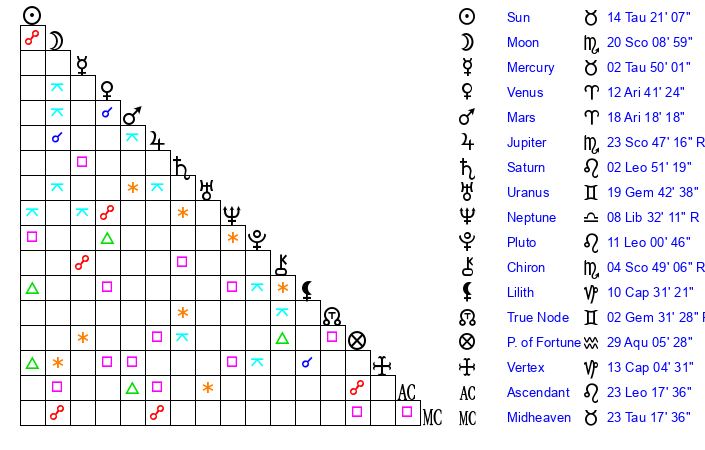 | Moon | 20 Scorpio 0 | 28 Leo 42 | 1 Libra 31 |