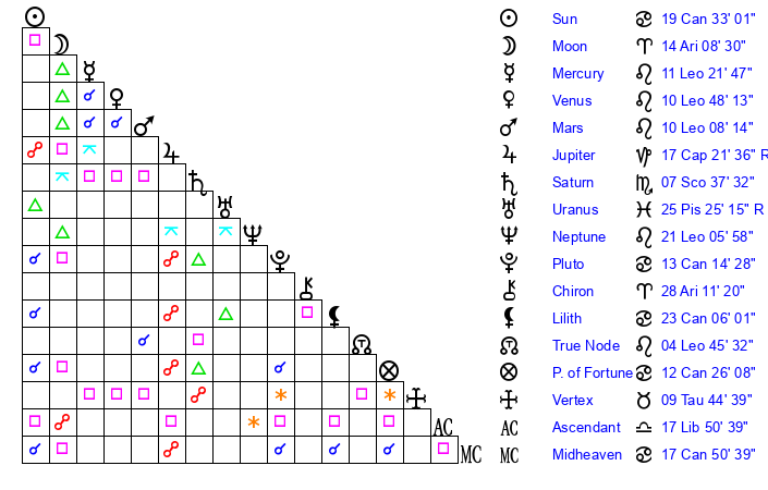 | Moon | 14 Aries 13 | 9 Aquarius 42 | 0 Sagittarius 24 |