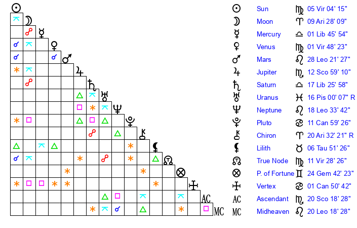 | Neptune | 18 Leo 33 | 1 Aries 24 | 20 Leo 18 |