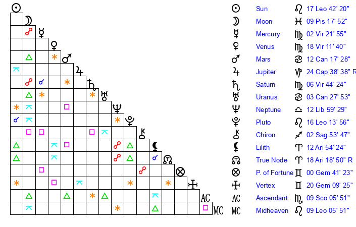 | Sun | 17 Leo 43 | 18 Leo 19 | 1 Scorpio 57 |