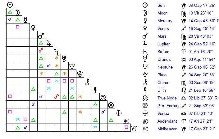 | Moon | 13 Virgo 21 | 6 Capricorn 43 | 21 Virgo 52 |
