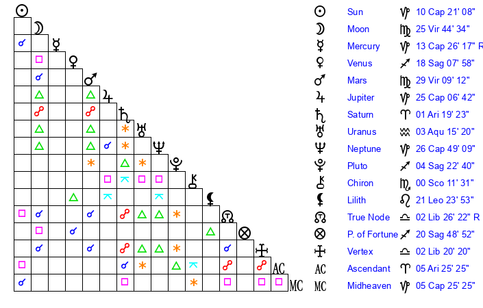 | Jupiter | 25 Capricorn 6 | 13 Gemini 14 | 1 Aquarius 40 |