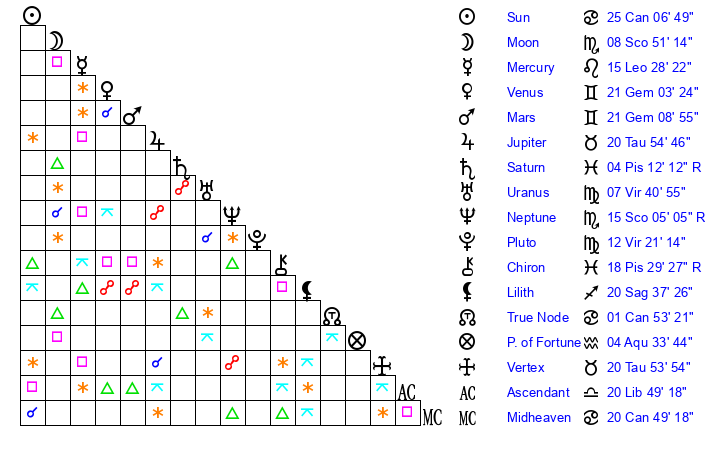 | Pluto | 12 Virgo 22 | 2 Aquarius 45 | 14 Virgo 21 |