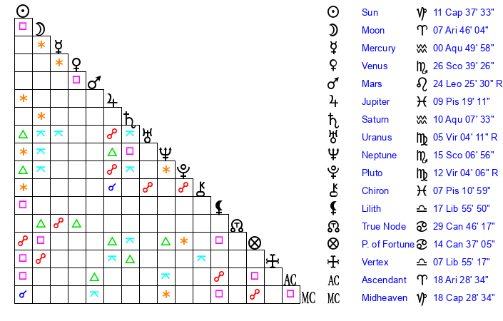 | Saturn | 10 Aquarius 22 | 14 Pisces 35 | 17 Aquarius 36 |