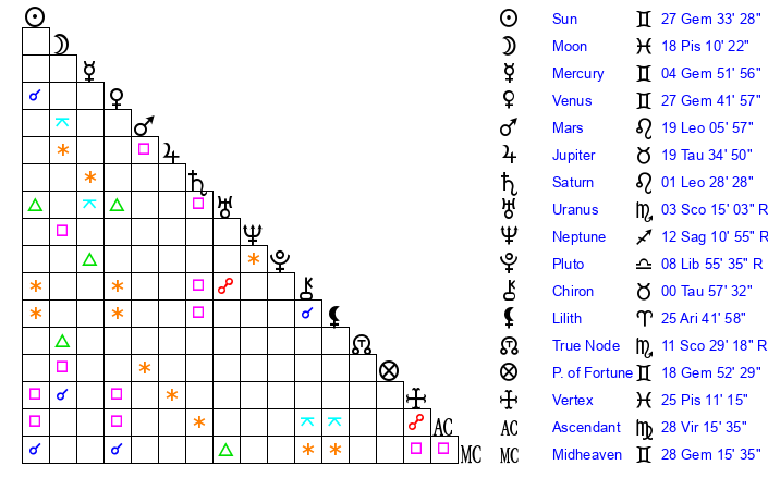 | Sun | 27 Gemini 33 | 27 Gemini 42 | 14 Leo 20 |