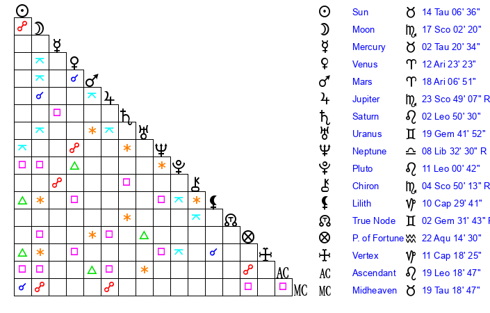 Jupiter | 23 Scorpio 40 | 22 Gemini 17 | 17 Scorpio 38 |