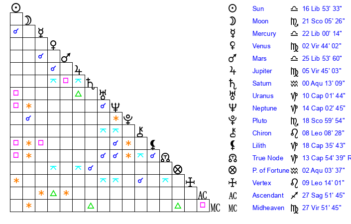 | Moon | 21 Scorpio 8 | 7 Gemini 2 | 11 Aquarius 16 |