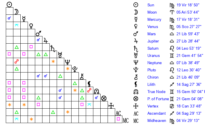 | Sun | 19 Virgo 19 | 20 Virgo 11 | 7 Sagittarius 54 |