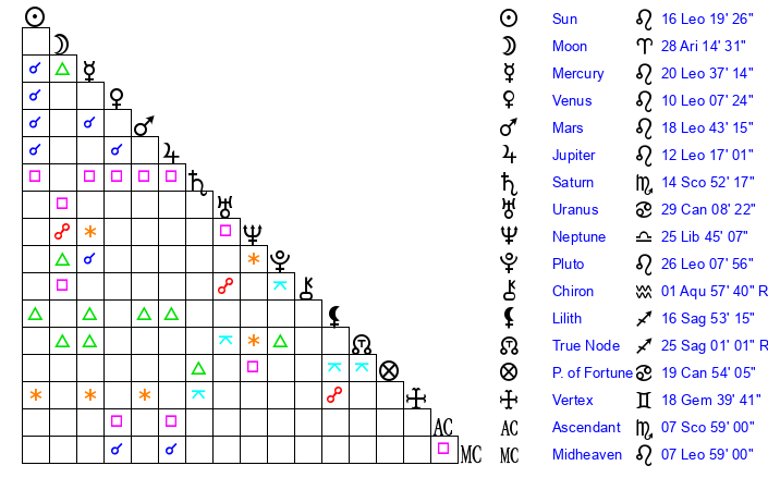 | Pluto | 26 Leo 7 | 2 Aquarius 13 | 28 Leo 9 |