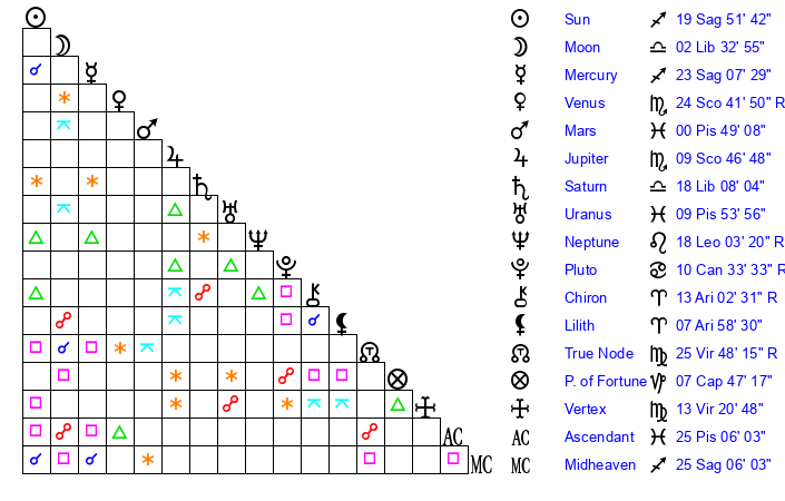 | Saturn | 18 Libra 44 | 25 Pisces 15 | 18 Libra 28 |