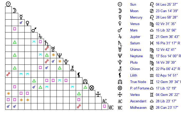 | Mercury | 28 Leo 59 | 12 Leo 6 | 0 Libra 51 |