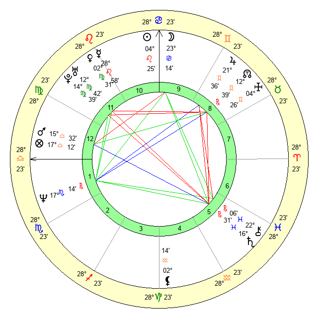 | Moon | 23 Cancer 15 | 10 Virgo 48 | 10 Libra 4 |