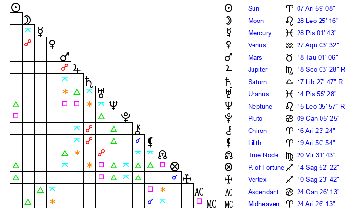 | Saturn | 18 Libra 10 | 24 Pisces 8 | 14 Libra 25 |