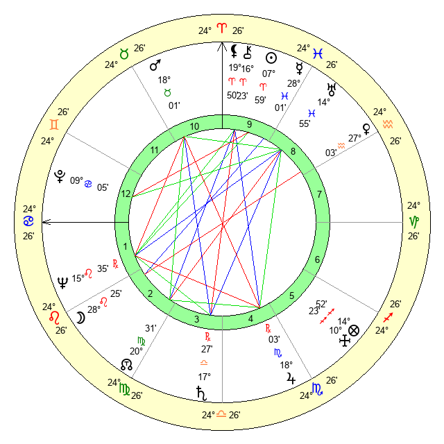 | Sun | 7 Aries 59 | 9 Aries 15 | 16 Cancer 26 |