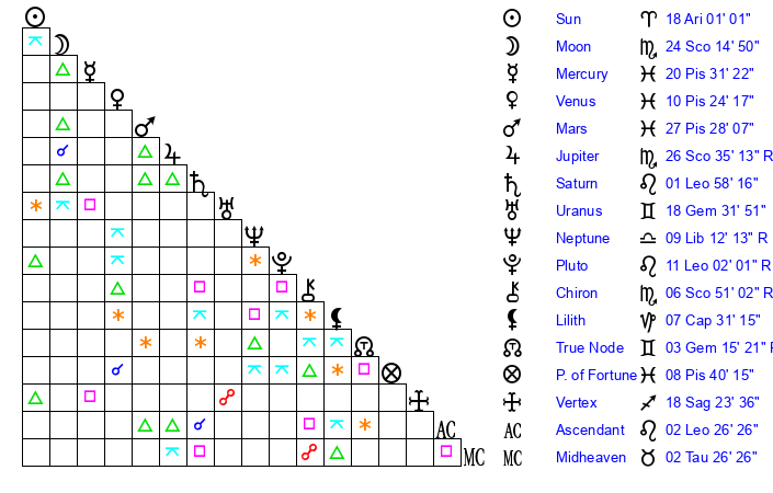 | Saturn | 2 Leo 26 | 25 Pisces 19 | 7 Leo 47 |