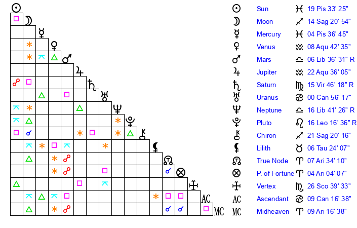 | Saturn | 16 Virgo 20 | 21 Pisces 48 | 13 Virgo 11 |