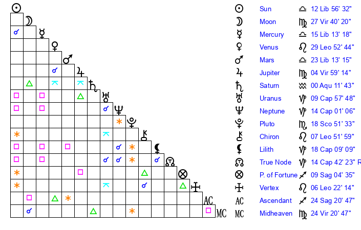 | Moon | 27 Virgo 37 | 7 Aries 24 | 23 Sagittarius 52 |