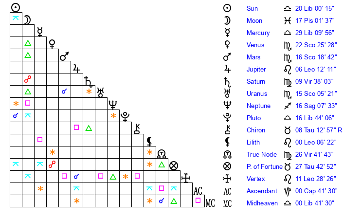 | Moon | 17 Pisces 0 | 19 Cancer 52 | 28 Scorpio 30 |