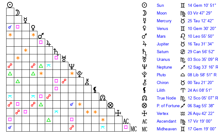 | Sun | 14 Gemini 10 | 14 Gemini 19 | 0 Leo 56 |