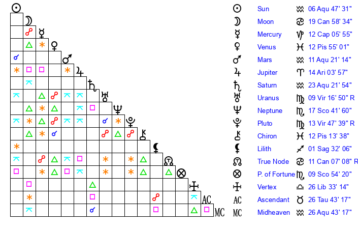 | Pluto | 13 Virgo 48 | 1 Aquarius 54 | 12 Virgo 18 |