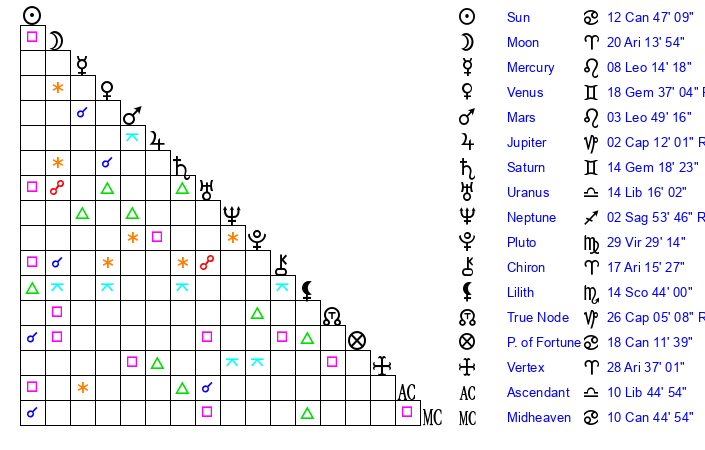 | Saturn | 14 Gemini 33 | 1 Aries 45 | 19 Gemini 39 |