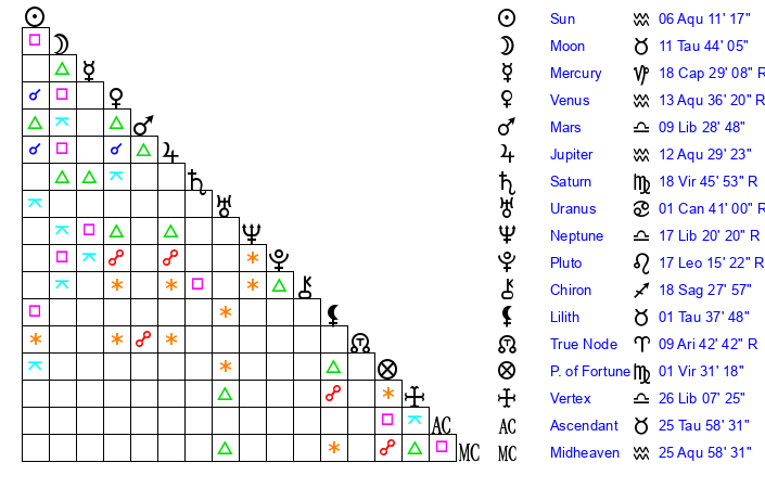 | Moon | 11 Taurus 39 | 1 Capricorn 41 | 18 Aquarius 6 |