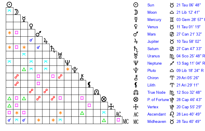 | Sun | 21 Taurus 6 | 21 Taurus 15 | 8 Cancer 3 |