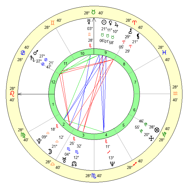 | Moon | 21 Libra 20 | 10 Scorpio 19 | 3 Leo 38 |